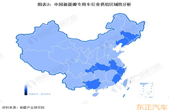 中國新能源專用車行業(yè)具有明顯的區(qū)域性。在供給方面,新能源專用車制造企業(yè)主要集中在廣西、福建等沿海地區(qū),供給區(qū)域性明顯;在需求方面,新能源專用車制造企業(yè)需求主要集中在東部地區(qū)與中部地區(qū)并逐漸向全國分散。