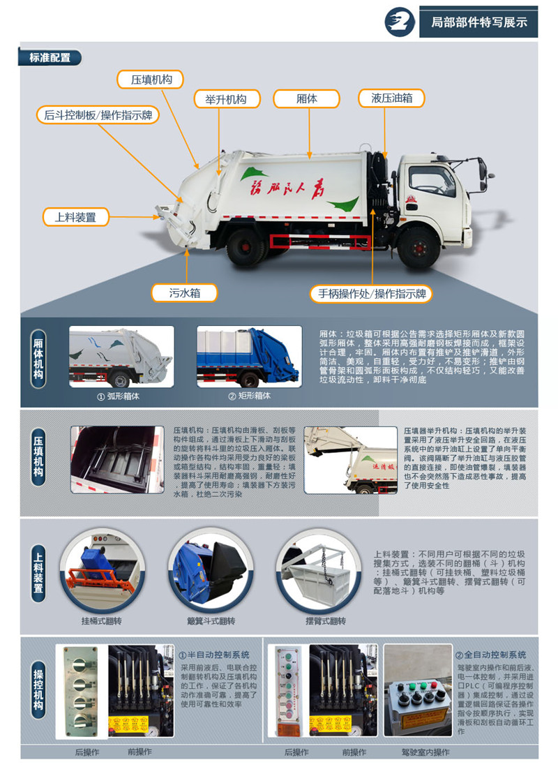 上裝配置:廂體圓弧設(shè)計(jì)(增強(qiáng)廂體承受力),Q345錳鋼板(高強(qiáng)度耐磨抗壓材質(zhì),罐體試用壽命更長),前后雙向壓縮,推鏟卸料,長源液壓泵,中梅多路換向閥,維森博樂油缸,高耐壓液壓油管,西門子PLC一鍵操作系統(tǒng)(駕駛室內(nèi)外均可操作),移動(dòng)遙控器控制箱體操作,雙污水箱(前后各一個(gè)),邊燈,高位示廓燈,夜間作業(yè)燈。