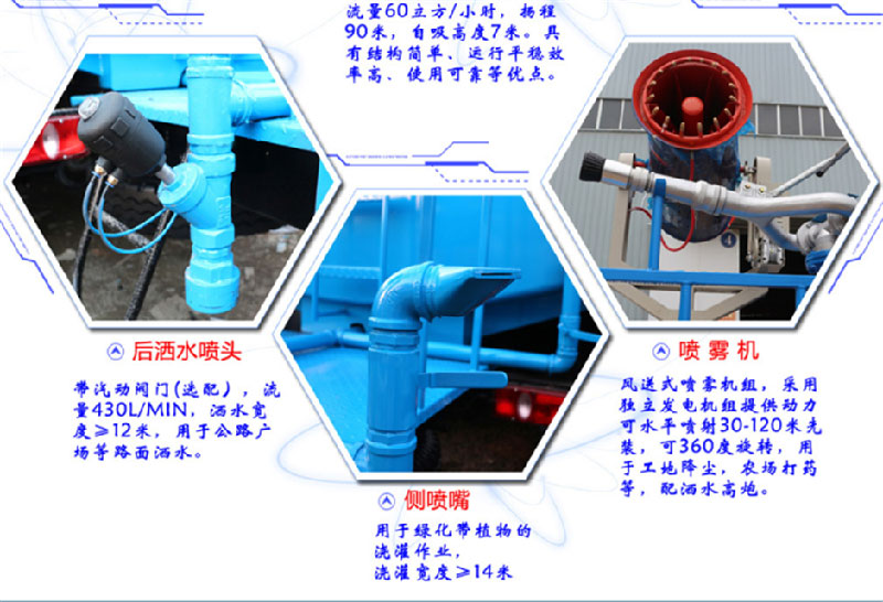 上裝配置:罐體采用國標(biāo)Q235碳鋼板材制作,產(chǎn)品質(zhì)量成熟可靠,設(shè)計**合理,比同類灑水泵吸程遠(yuǎn)、壓力大、使用壽命長,可泵進(jìn)泵出。前沖、后灑、側(cè)噴、高位花灑、帶后工作平臺及綠化灑水高炮(可全方位旋轉(zhuǎn),可連續(xù)調(diào)成直沖狀、大雨、小雨、毛毛雨等),抑塵霧炮(可降塵、噴霧、消毒、打農(nóng)藥等),水位計,消防栓接口、快速接口、兩根輸水管,其余標(biāo)配。
